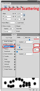 pengaturan brush Kemudian klik pada Shape Dynamcs dan Scattering. untuk pengaturannya sobat bisa lihat digambar.